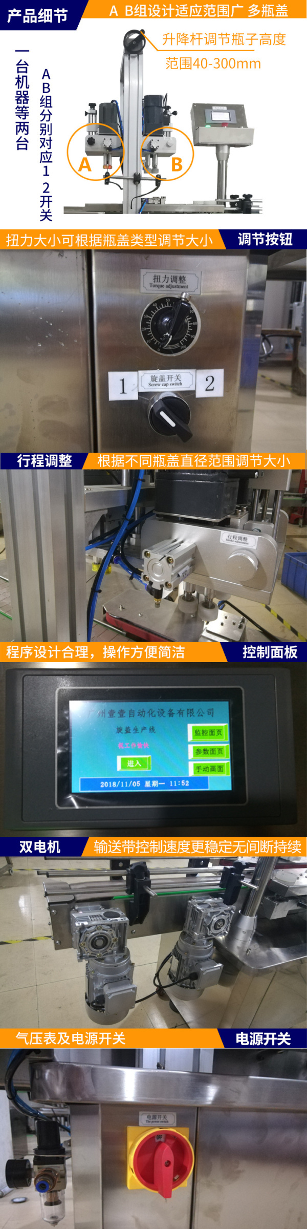 塑料瓶玻璃瓶全自動(dòng)雙組電機(jī)旋蓋機(jī)是本公司自主研發(fā)的旋蓋機(jī)系列,本系列包含全自動(dòng)理蓋旋蓋機(jī)、全自動(dòng)配線旋蓋機(jī)、全自動(dòng)直線旋蓋機(jī)、全自動(dòng)雙列直線旋蓋機(jī)。一機(jī)兩用,及一臺(tái)機(jī)等兩臺(tái),本機(jī)采用AB兩組旋蓋設(shè)計(jì),覆蓋瓶蓋范圍廣,A組瓶蓋范圍為20-55mm,B組瓶蓋范圍15-30mm,兩組可根據(jù)瓶蓋自由轉(zhuǎn)換,解決了每組范圍內(nèi)的旋蓋更穩(wěn)定,效率更高效。采用PLC控制程序,程序設(shè)計(jì)合理,操作方便簡潔。